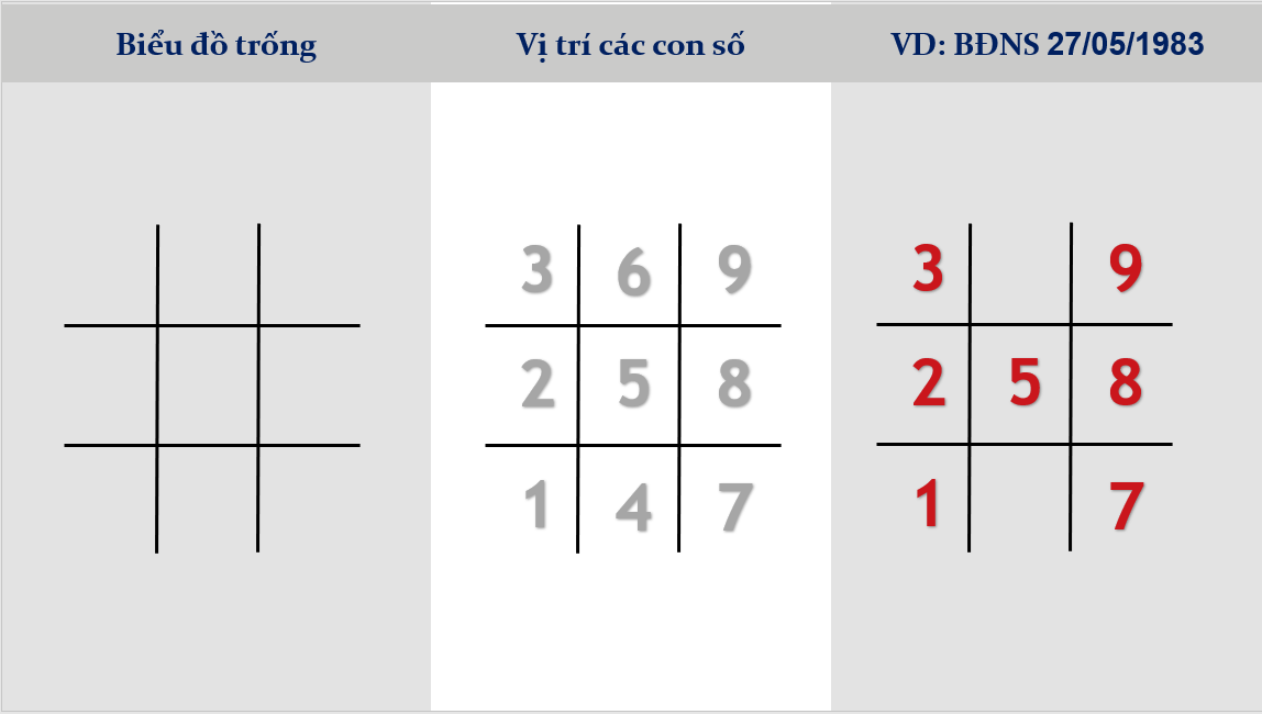 Bước 3: Nhìn lại vị trí của các con số trong Biểu đồ mẫu. Tùy theo ngày sinh cụ thể, hãy đặt các con số trong ngày sinh của ta vào các ô tương ứng. (Xem hình minh họa ví dụ của ngày sinh 27/5/1983). Có thể có nhiều con số được lặp lại, cứ gắp thả hết vào đúng vị trí ô đó. Những ô nào ngày sinh ta không có, thì bỏ trống.